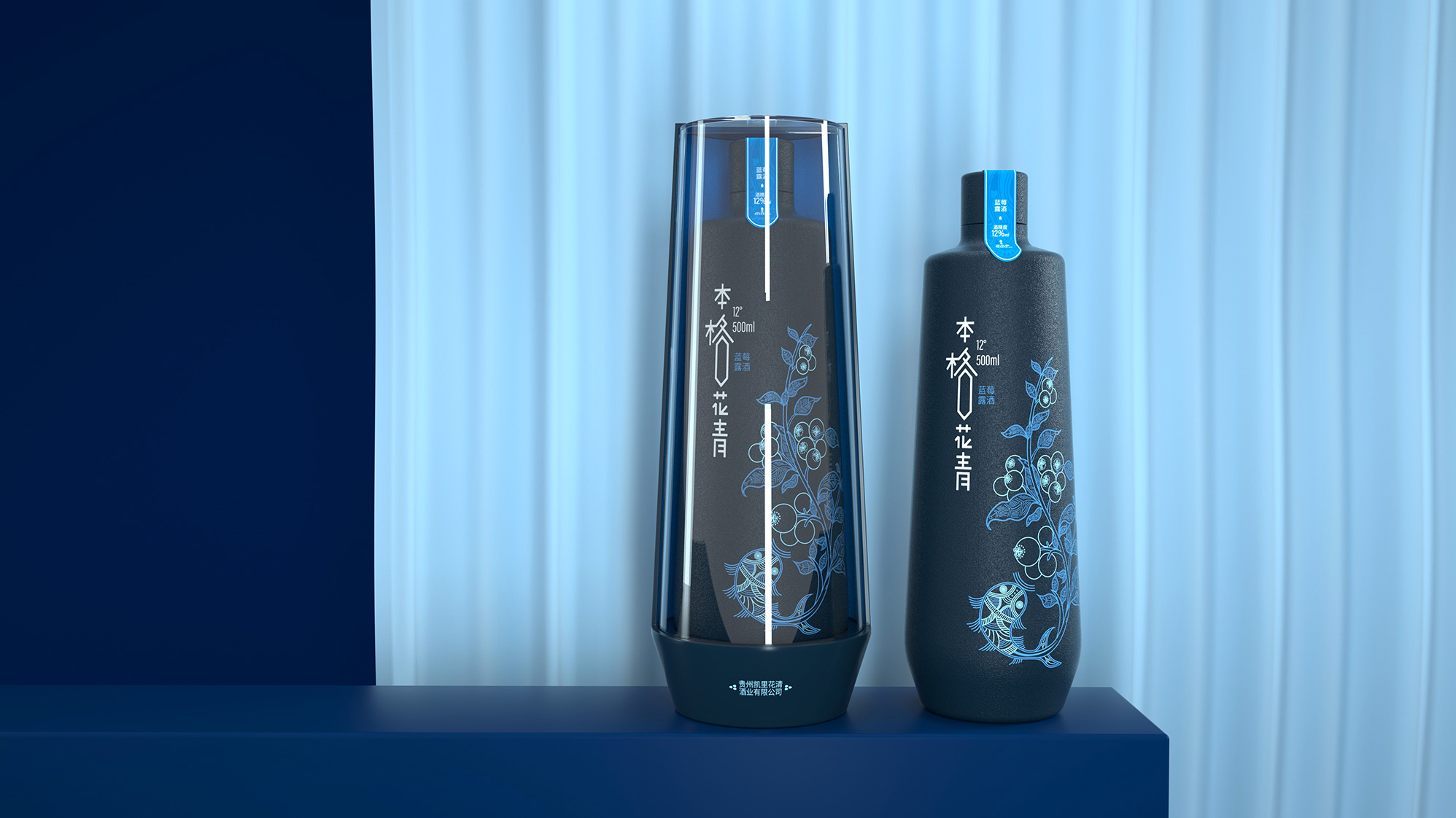 历时一年,本格花青酒再次进行升级设计,首先贵州步道创意团队对品牌原有的主识别符号进行了升级,因为贵州步道创意团队发现“本格花青”主识别符号难以进入消费者心目中,同类型产品同质化较多,无法突出品牌。针对这个问题贵州步道创意团队对主识别符号进行了升级,区别于品牌同质化产品,具有差异性,独特性,便于消费者识别。容器方面,摒弃原有的瓶体,改用异型瓶并沿用原有磨砂质感,增强视觉感官,同时也起到防滑作用。包装方面,摒弃原有常规包装,改用透明亚克力和塑料PVC材质异型盒。我们将产品进行突破性的打造,打破传统的包装样式,让产品深入消费者的心中,成为新的吸引点。