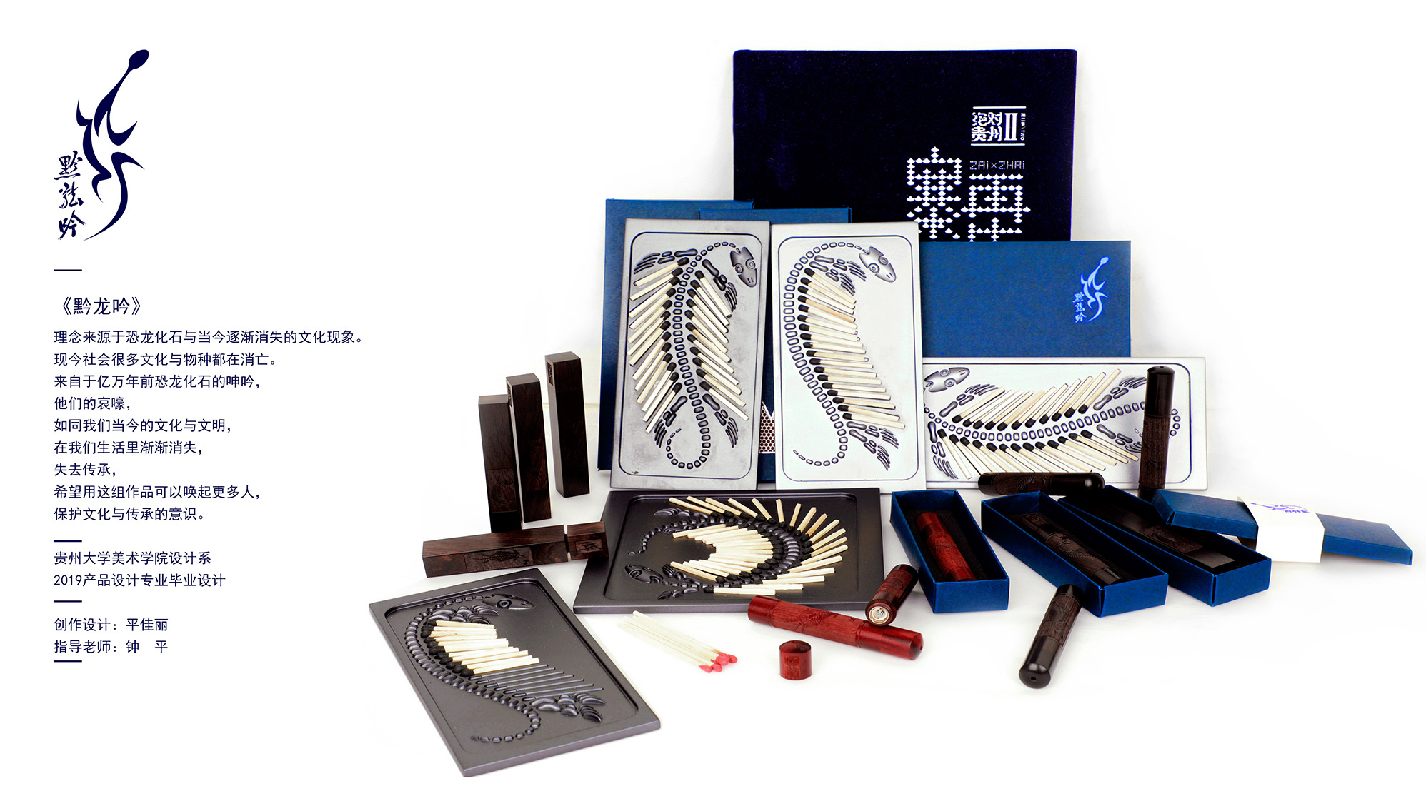此创作来源于恐龙化石与当今逐渐消失的文化现象。现今社会很多文化与物种都在消亡。来自于亿万年前恐龙化石的呻吟,他们的哀嚎,如同我们当今的文化与文明,在我们生活里渐渐消失,失去传承,希望用这组作品可以唤起更多人,保护文化与传承的意识。